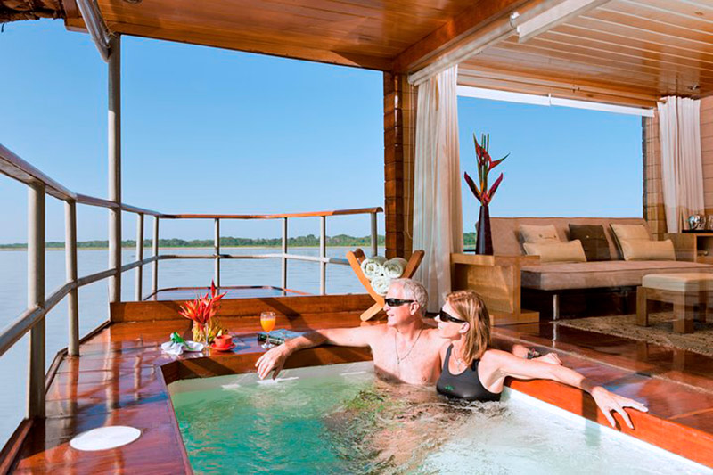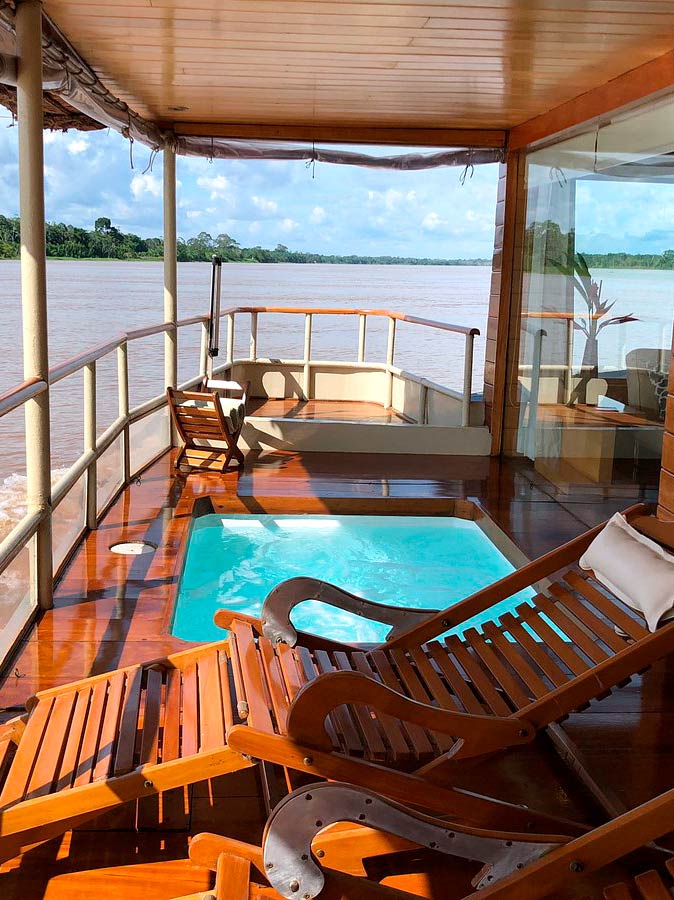 - Viva uma experiência de luxo ao longo do rio Amazonas, no Peru. O cruzeiro ‘Aria Amazon’ inclui todo o conforto de uma embarcação luxuosa. O serviço dura 5 dias e 4 noites. O primeiro dia é de boas-vindas, visita à cidade de Iquitos e embarque no cruzeiro. O segundo dia é a excursão ao longo do rio Yanallpa e do rio Dorado. No terceiro dia navegaremos pelos rios Pacaya, Ucayali e Tapiche para ver uma grande variedade de flora e fauna. No quarto dia conheceremos o estilo de vida de um povo amazônico. No último dia visitaremos um centro de resgate de peixes-boi e retornaremos ao aeroporto de Iquitos. O serviço está com tudo incluído: transporte, alimentação, guias, ingressos e muito mais.