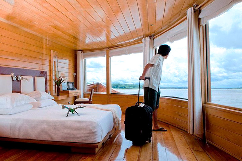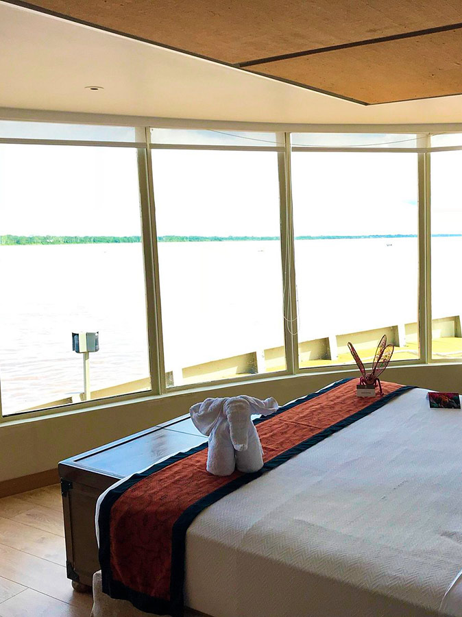 - Suítes com muito conforto, elegância e requinte. Inclui janelas estilo cinema com vista para o Rio Amazonas, camas King size (ou de casal), mesinhas de cabeceira, banheiros orgânicos, espelhos, cofre, área de espera, ar condicionado, banheiro privativo com ducha quente e muito mais.