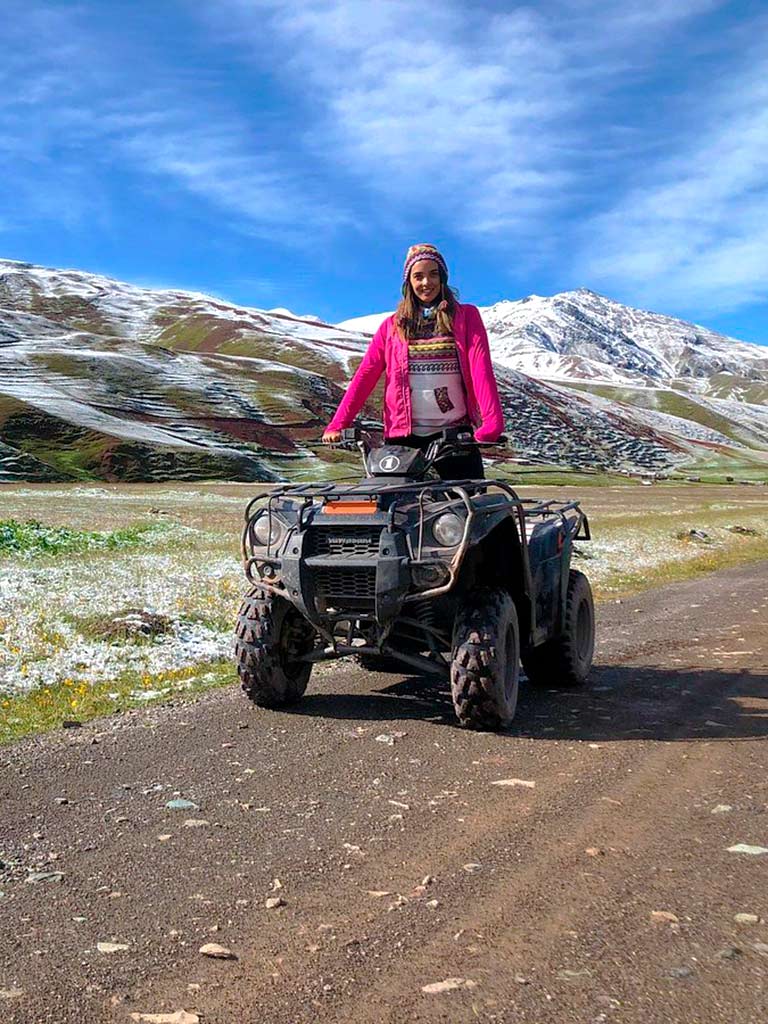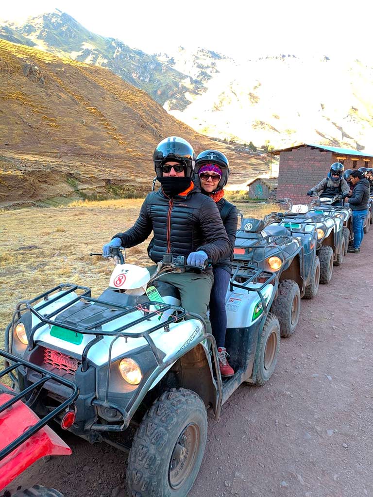 - Após preparação prévia, iniciaremos a aventura em quadriciclo. A viagem dura 1 hora e 30 minutos rodeada de paisagens incríveis. O ponto de chegada será a comunidade de Qosqopata.