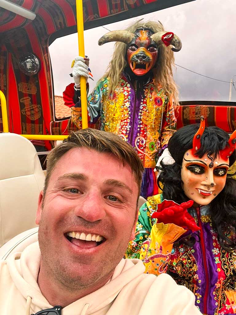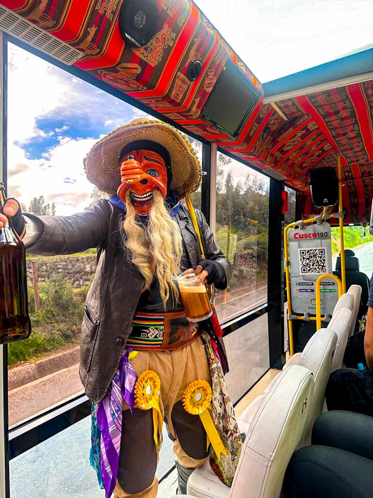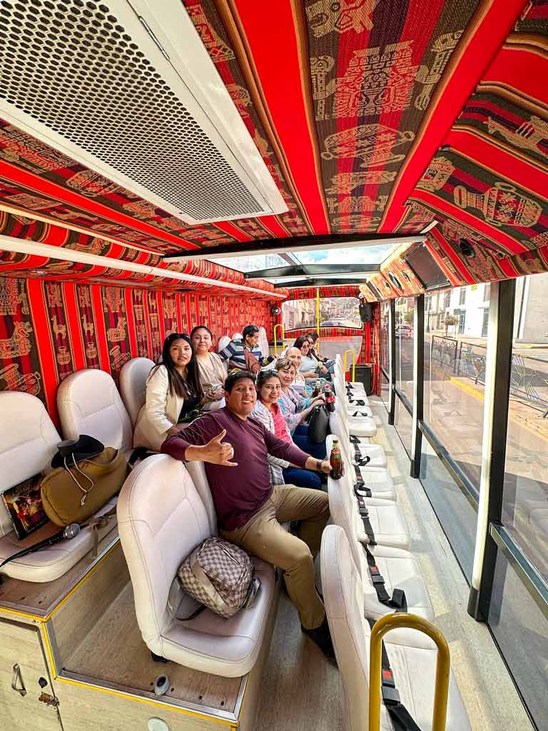 O 180° Scenic Bus Tour não é um passeio tradicional, é uma experiência cheia de energia e diversão. Com música ao vivo de um DJ, luzes de LED interativas e entretenimento a bordo, esse passeio transforma cada quilômetro em uma celebração. Além disso, a “Crazy Hour” com personagens surpresa fará com que ninguém fique parado, então aproveite Cusco de uma maneira única e inesquecível!