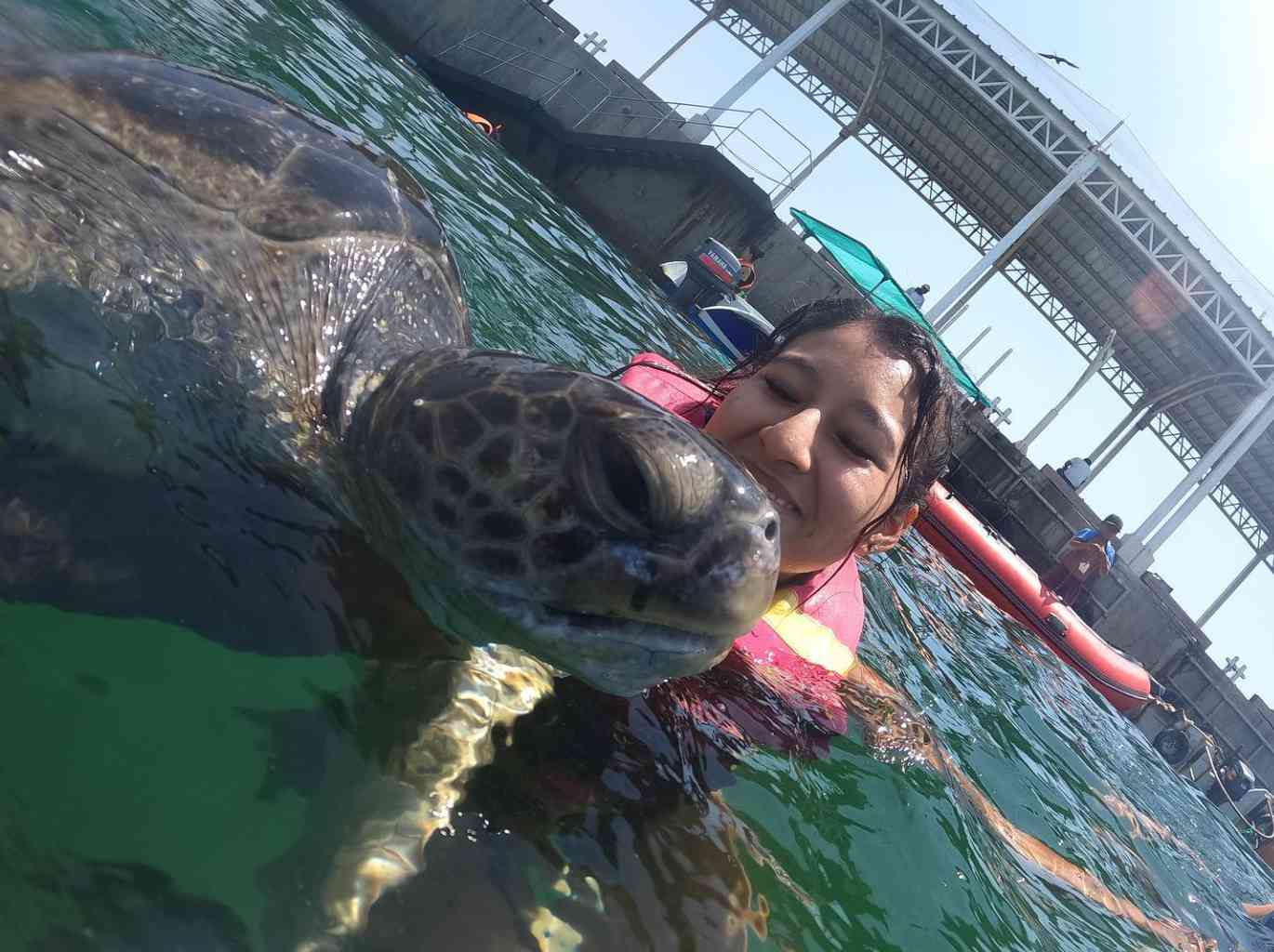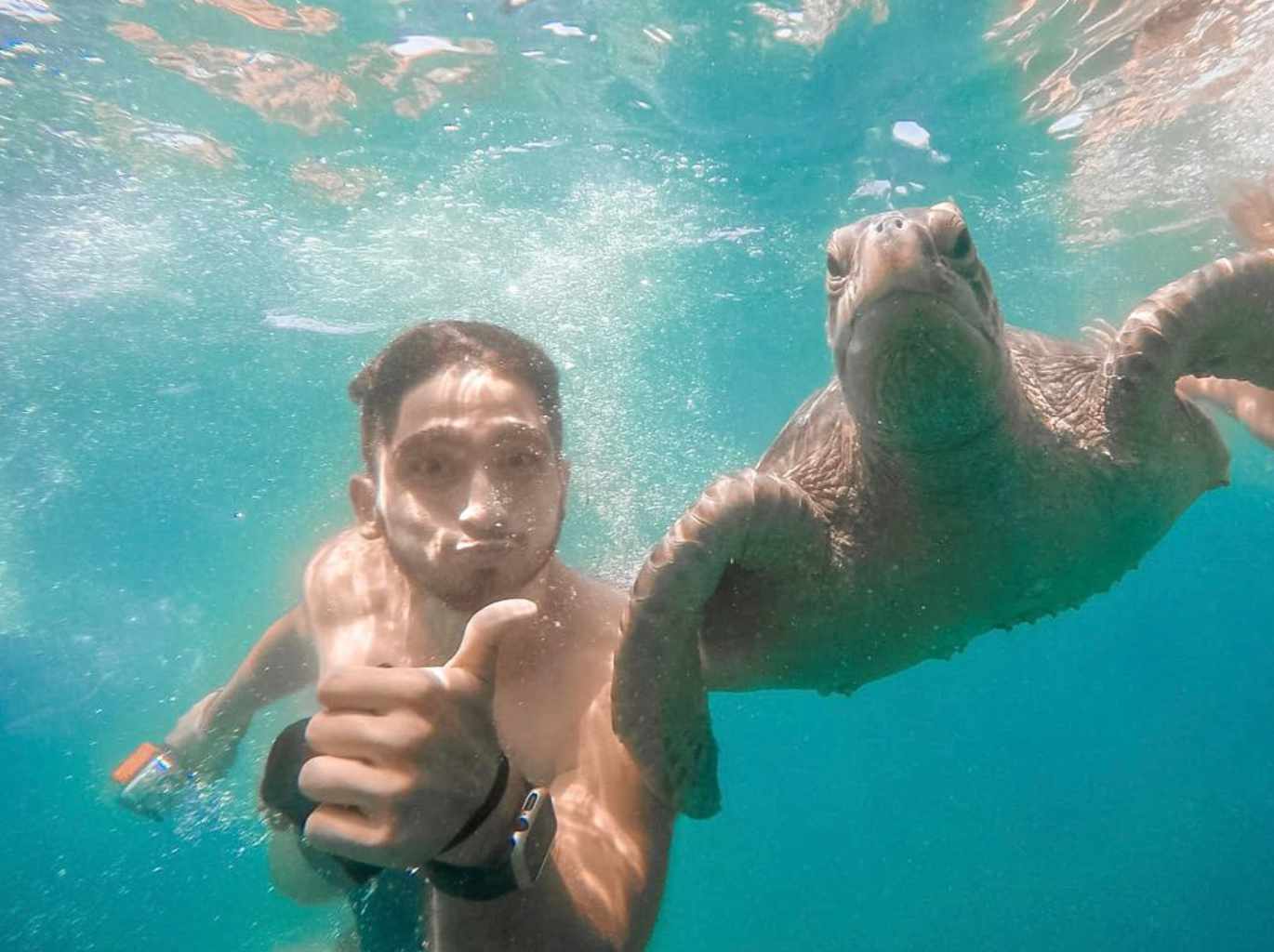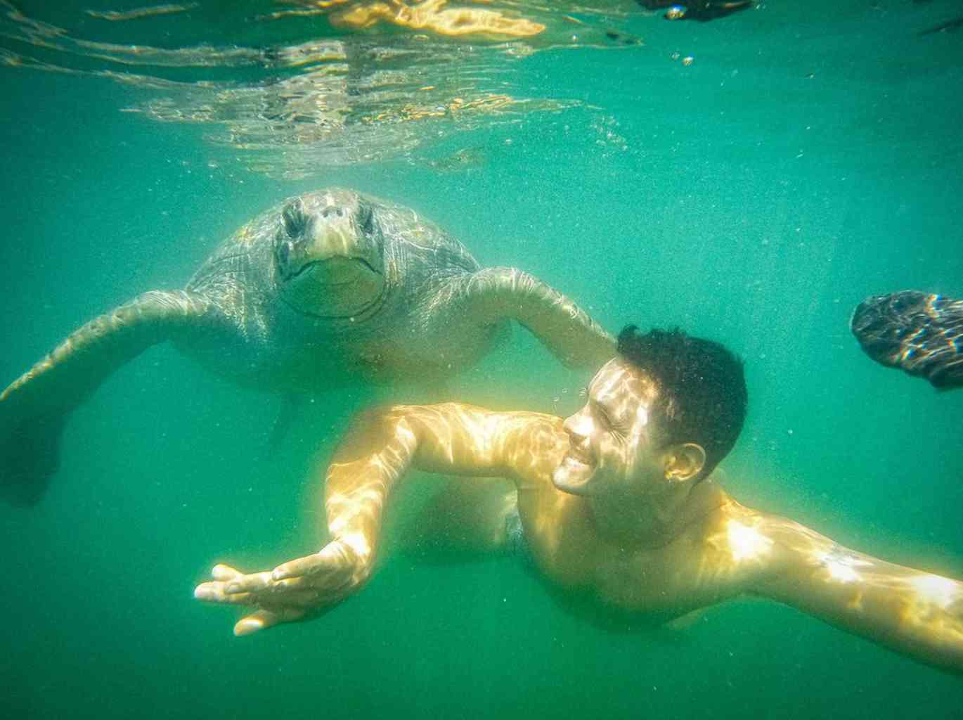 - Depois continuaremos mar adentro até chegar à área onde acontece a experiência de nadar com tartarugas. Ali, em uma plataforma flutuante, o visitante poderá tirar fotos aquáticas incríveis, sempre acompanhado de seu guia profissional. No total, existem mais de trezentas tartarugas marinhas. Lá você também pode praticar mergulho com snorkel com esses lindos animais.