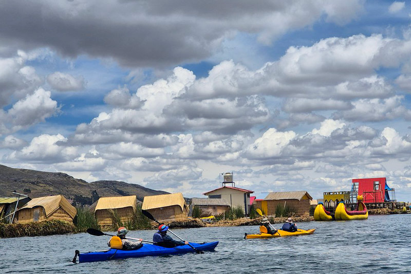 - A viagem começa com um traslado do seu hotel até a baía da Ilha dos Esteves, onde um guia faz uma palestra introdutória sobre a rota e a técnica de caiaque. Ao começar a remar, você se sente conectado à imensidão do lago enquanto observa a biodiversidade do lugar: pássaros como mergulhões, patos e parihuanas voam sobre as taboas. Após aproximadamente uma hora e meia de remo, a chegada às Ilhas Uros marca o encontro com uma cultura milenar. A comunidade local recebe os visitantes com hospitalidade e compartilha seu modo de vida. O passeio de caiaque pelas ilhas flutuantes é o final perfeito para esta aventura. Por fim, o retorno à cidade de Puno deixa os participantes com a sensação de terem vivido uma experiência inesquecível em um dos cenários naturais mais impressionantes do Peru.