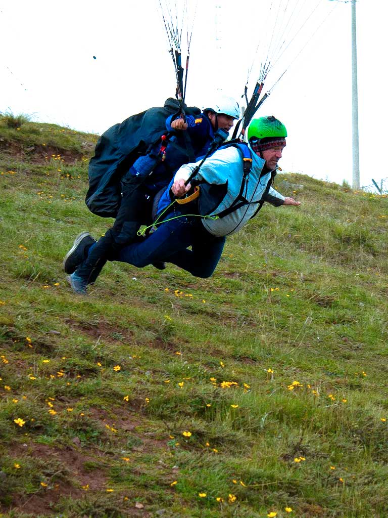 - After this rest we continue with the trip uphill until we reach Cerro Sacro, at an altitude of 3,880 meters above sea level. There, together with a group of professionals, we will be welcome to receive a ‘briefing’ or informative talk prior to the great adventure. We will practice how to perform the flyover in the company of our professional guide who will accompany us during the tandem flight. The overflight also includes all the professional safety equipment necessary to enjoy this extreme adventure in total safety.