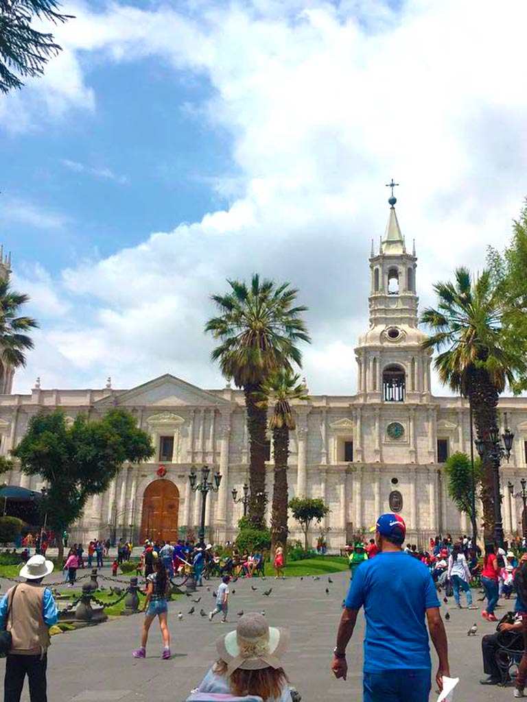 - Tras la visita al convento de Santa Catalina continuaremos a pie hasta la Plaza de Armas (ubicado a solo unos pasos). Allí conoceremos su historia, arquitectura e importancia. Luego apreciaremos la fachada de la Catedral de Arequipa, de estilo neorrenacentista. Todos los recorridos serán en compañía de nuestro guía turístico profesional.