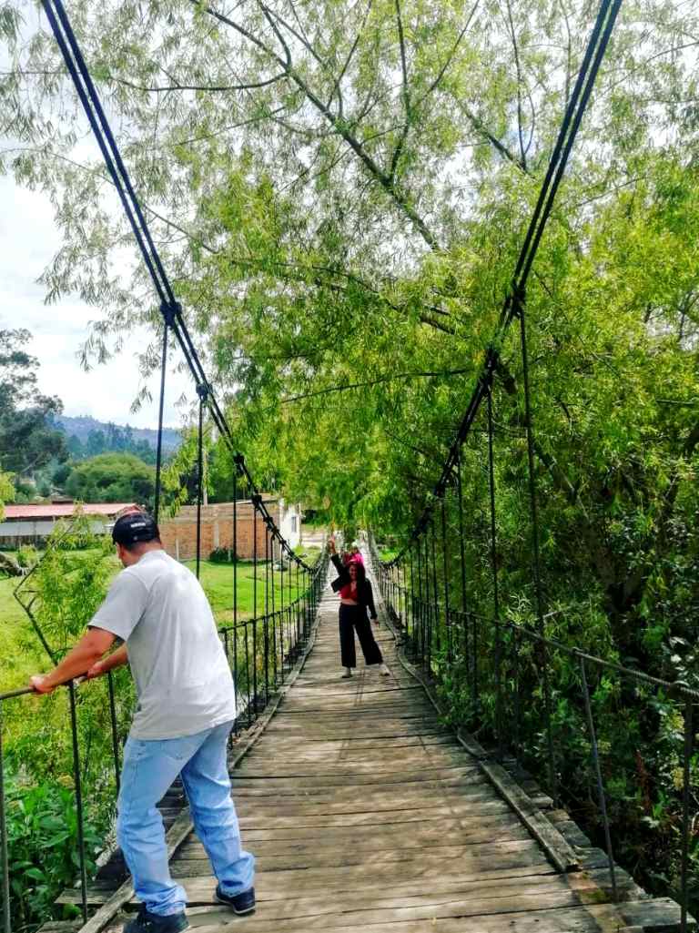 - Una vez listo el grupo partiremos por carretera al distrito de Baños del Inca donde haremos un alto en el bello río Chonta (ubicado a solo 7 kilómetros de la ciudad de Cajamarca). Tendremos la oportunidad de cruzar un puente colgante, siempre con la compañía de nuestro guía turístico. Esta aventura es muy segura y permite respirar aire puro en un momento de aventura durante el tour.