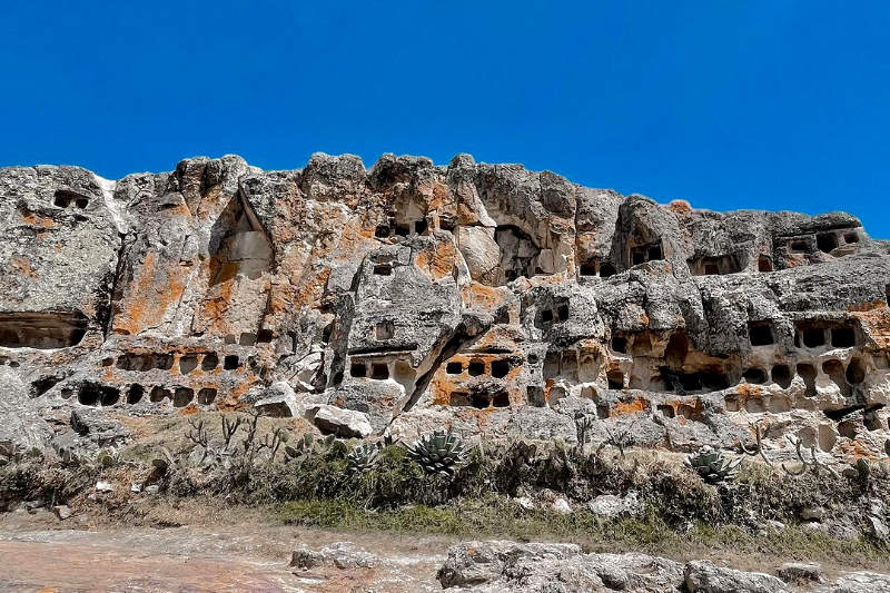 - A continuación, seguiremos por carretera unos 5 kilómetros más hasta arribar a las históricas ventanillas de Otuzco. Este sitio arqueológico fue un cementerio cavado en las laderas de una formación de roca volcánica. Allí la cultura Cajamarca (200 D.C. – 800 D.C.) enterraban a sus muertos. Los nichos fueron hechos con una profundidad de hasta 10 metros. Los orificios, similares a ventanas, posee formas cuadrangulares o rectangulares. En su interior, los nichos se conectan formando especies de pasadizos. Se trata de uno de los cementerios más antiguos del Perú, ya que se remontan casi a inicios del siglo XX (poseen casi dos mil años de antigüedad).