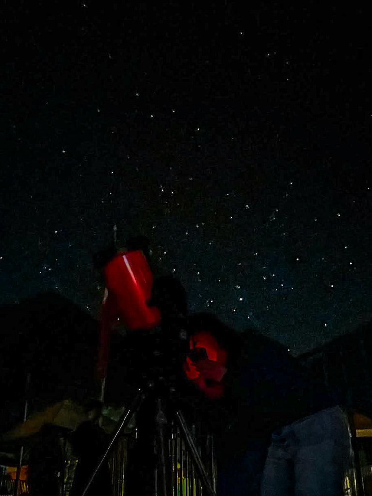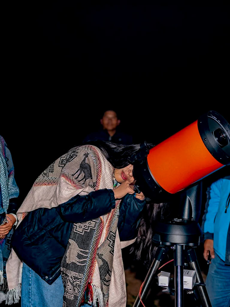 - Si el clima lo permite, saldremos a una zona de observación al aire libre, donde utilizaremos telescopios para admirar objetos celestes en tiempo real. Dependiendo de la visibilidad, podremos observar estrellas, planetas, nebulosas y constelaciones del hemisferio sur, guiados por expertos que nos ayudarán a identificarlos y comprender su importancia en la astronomía moderna y ancestral.