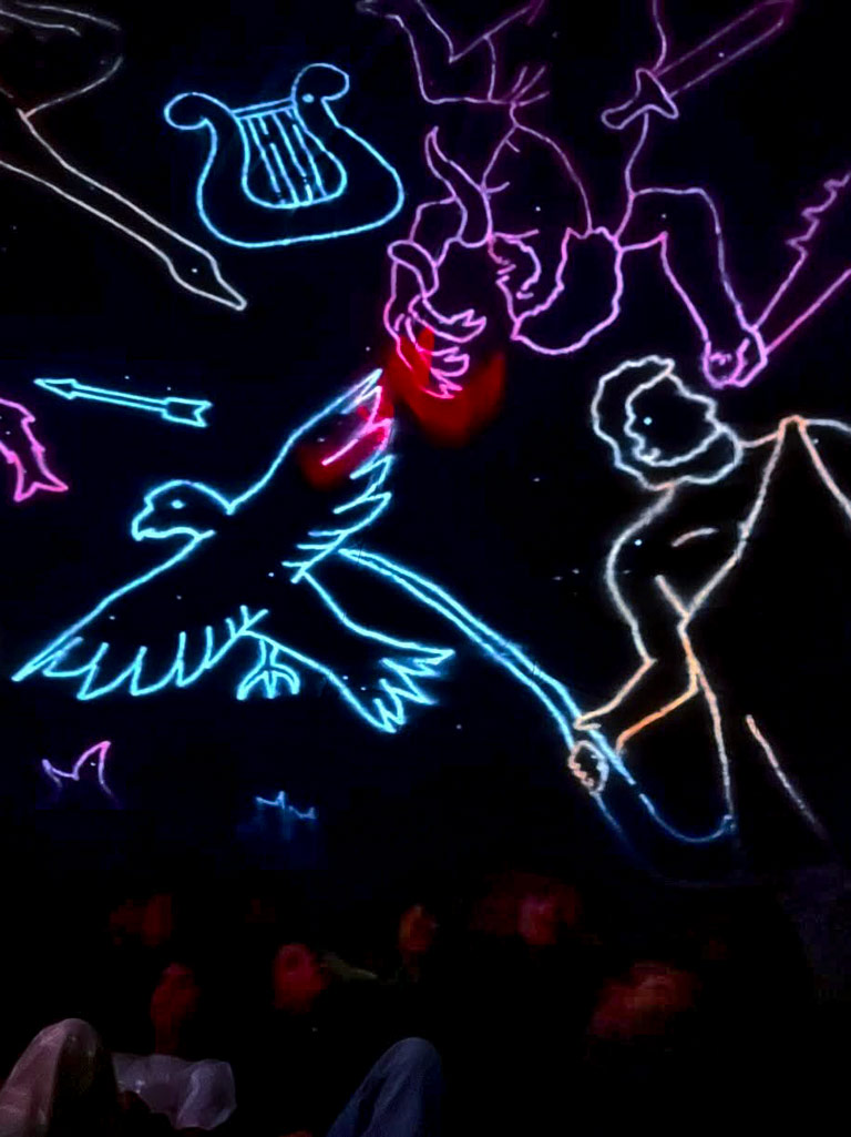 - Nos dirigimos a la cúpula para disfrutar de una impresionante proyección del cielo nocturno. Aquí veremos una recreación detallada de las estrellas y constelaciones oficiales, así como las constelaciones incaicas.