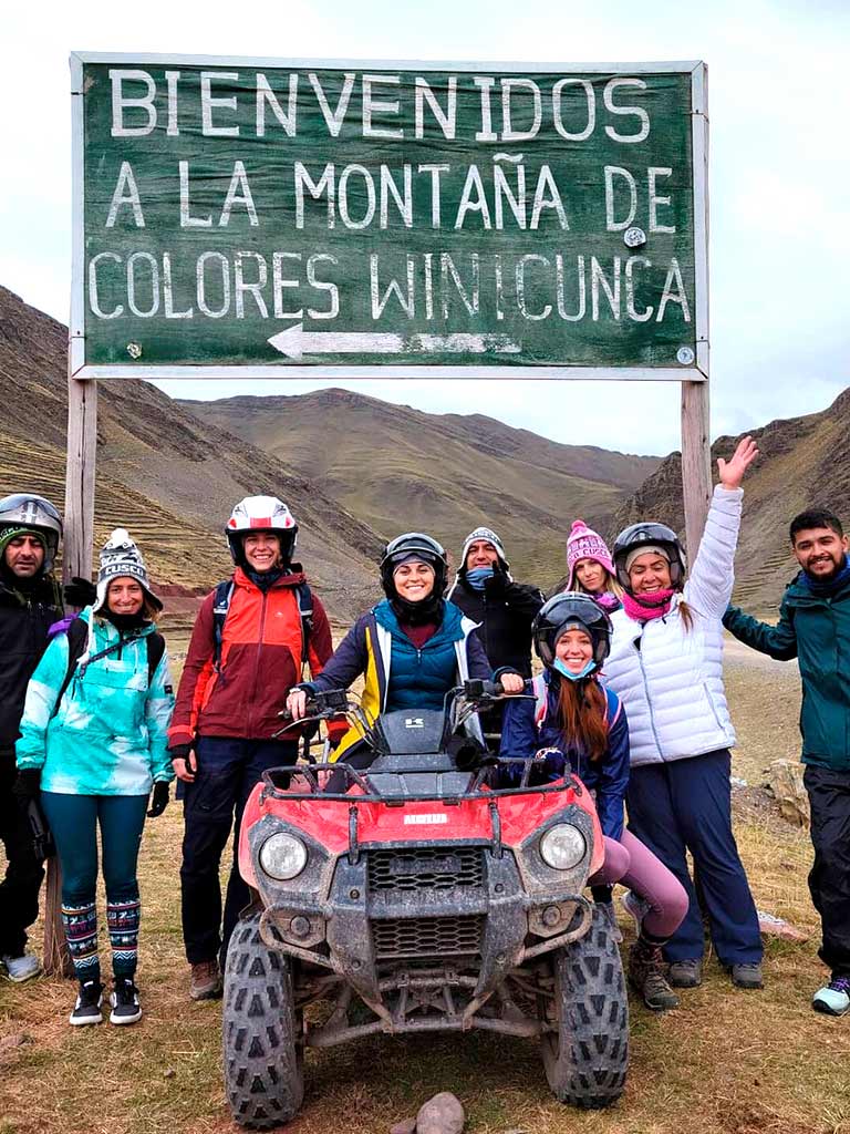 - Disfruta del famoso Vinicunca dentro de una aventura en cuatrimoto memorable. El tour se realiza a las 3.30 am. con el recojo en la puerta de su hotel. Luego se viaja a Cusi pata donde se desayuna. La aventura en cuatrimoto es de 1 hora 30 minutos aproximadamente. Luego se realiza una corta caminata de 45 minutos hasta el Vinicunca. El tramo de retorno sigue la misma ruta.
