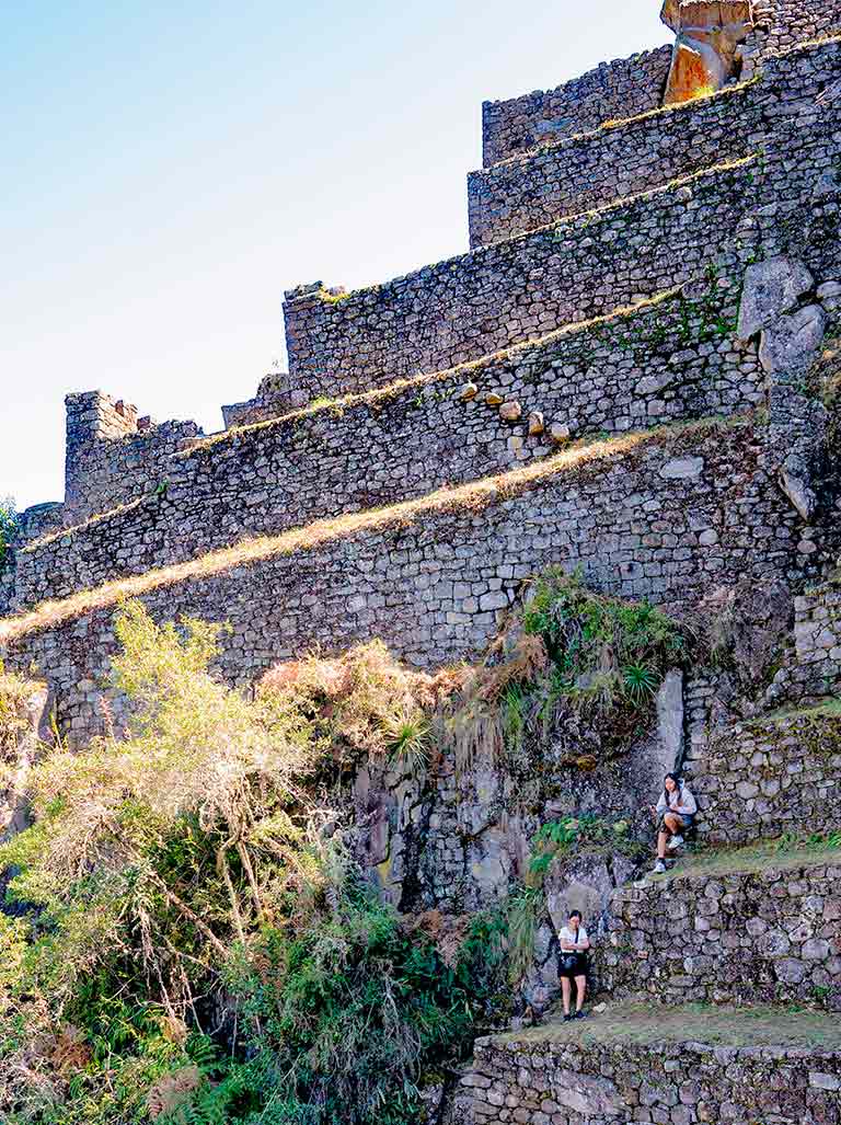 - A pocos pasos de la Roca Sagrada se ingresa al Huayna Picchu. La ruta por esta montaña es por escaleras de piedras hechas por los incas. Toma 1 hora 30 minutos llegar a la cima aproximadamente.