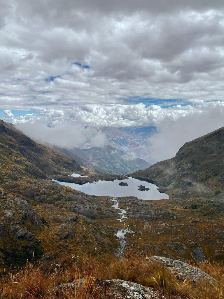 - A medida que se asciende, el camino se hace más rocoso y duro. La segunda laguna está a 3.800 msnm. Se caracteriza por los pequeños islotes en sus aguas turbias por las continuas caídas de agua en el camino.