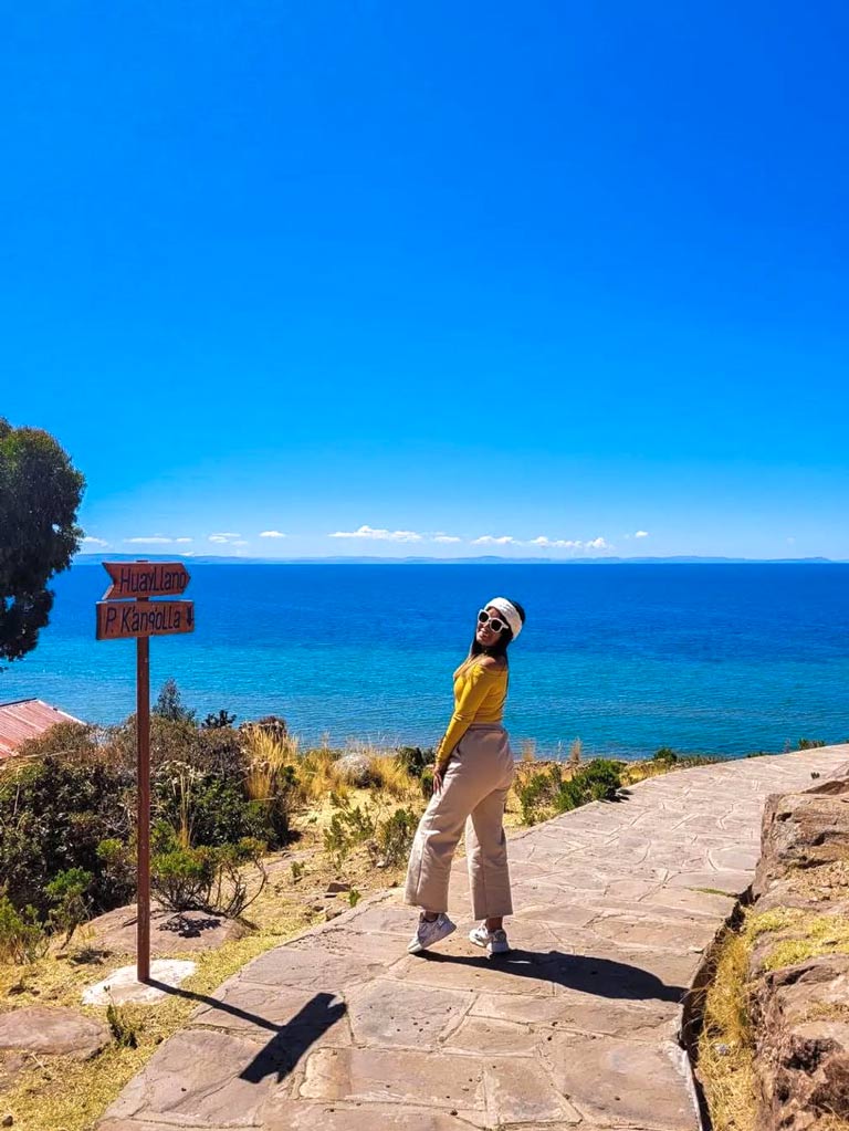- Al llegar a Taquile, los visitantes realizan una caminata de aproximadamente 1 hora hasta el pueblo principal. Durante el recorrido, se disfruta de impresionantes vistas del lago y los paisajes andinos.